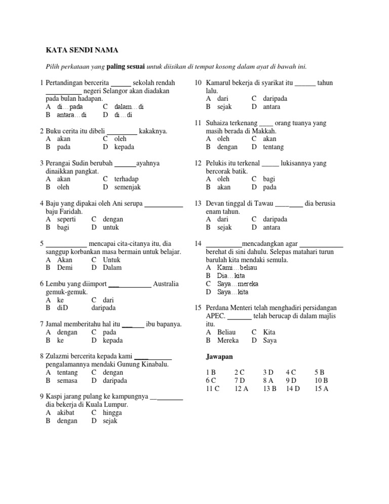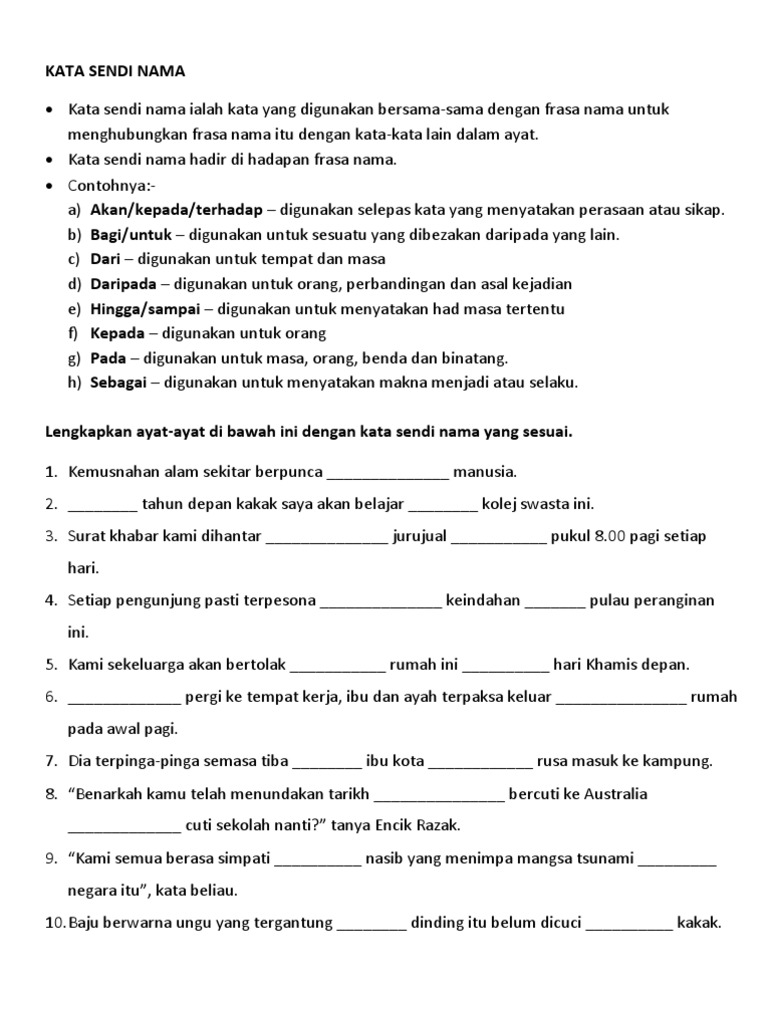 Kata Sendi Nama Meaning In English from i0.wp.com Kata sendi nama di menyatakan tempat tak boleh guna untuk masa! Menunjukkan tempat , arah ,katau waktu contoh : You can do the exercises online or download the worksheet as pdf. Buku teks bahasa melayu tahun 3 jilid 2 (muka surat 54). For your search query kata sendi nama mp3 we have found 1000000 songs matching your query but showing only top 10 results. Mengenal pasti dan menyenaraikan bm kata sendi nama tatabahasa bahasa melayu sekolah rendah tahun 1 2 3 4 5 6. Tahun kemarin memang banyak rintangan yang menghadang. Kata majmuk didefinisikan sebagai bentuk kata yang wujud apabila dua kata dasar atau lebih dirangkaikan kata majmuk bertindak sebagai satu unit dan dieja terpisah, melainkan kata majmuk yang telah mantap.