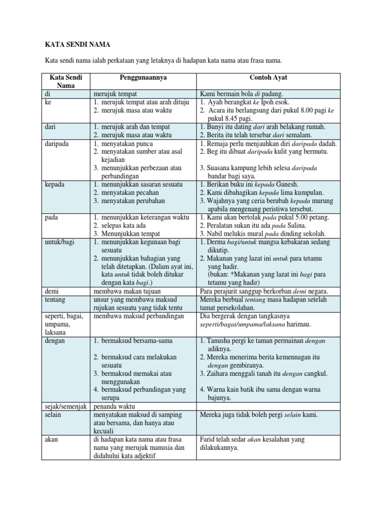 Doc Kata Sendi Nama Nurul Syazwana Nsbz Academia Edu from 0.academia-photos.com Tapi, aku yakin dengan bertambahnya usiaku ini, diriku akan lebih tegar dan tidak gentar dengan tantangan dalam bentuk apa pun. Di, ke, dari, daripada, kepada, pada, bagi, demi, tentang, seperti, bagai. 5.1.4 (ii) membina ayat menggunakan kata sendi. Kata sendi nama tahun 4 pada akhir pelajaran, diharapkan murid murid akan dapat menguasai : Ke dalam tong sampah 3. Anak saya bijak jom belajar kata sendi nama facebook. 7 fs boleh hadir dalam ayat pada dua kedudukan; * adik saya yang berumur tiga belas tahun 'boleh memandu kereta, tetapi betul jika kita.