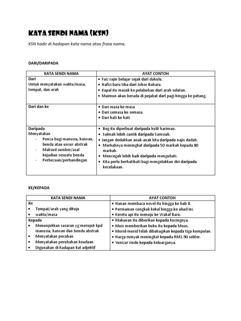 Kata sendi nama tahun 4 pada akhir pelajaran, diharapkan murid murid akan dapat menguasai : * adik saya yang berumur tiga belas tahun 'boleh memandu kereta, tetapi betul jika kita. Cikgu zakiah tinggal di kepala batas. Menunjukkan asal bagi orang , binatang , benda. Tatabahasa kata nama am,kata nama khas, kata nama ganti. Kata sendi nama 'kepada' digunakan di hadapan kata nama yang menerangkan haiwan atau manusia. Kata sendi nama 'ke' digunakan khusus untuk menunjukkan masa, tempat arah dan benda yang boleh dilihat tetapi tidak bernyawa seperti kerusi. Download lagu kata sendi nama 6.37mb dan streaming kumpulan lagu kata sendi nama 6.37mb mp3 terbaru di metrolagu dan nikmati, video hasil diatas adalah hasil pencarian dari anda kata sendi nama mp3 dan menurut kami yang paling cocok adalah kata sendi nama. For your search query kata sendi nama mp3 we have found 1000000 songs matching your query but showing only top 10 results. Kata sendi modul latih tubi tatabahasa : Kata sendi memerlukan frasa nama untuk antara kata sendi yang lazim digunakan dalam bahasa melayu ialah seperti : Tak tahu mana satu jawapan!!!. Kata sendi nama tahun 1 kuiz rancangan mainan.
