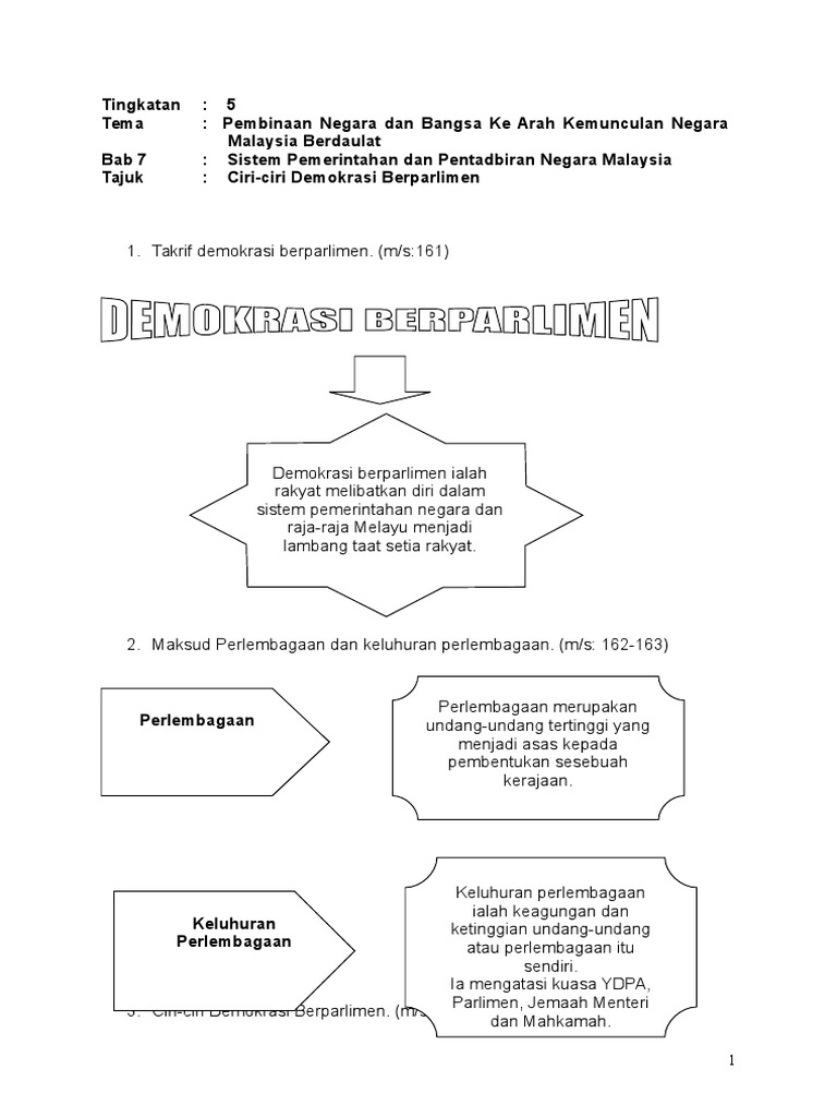 Negara demokrasi lahir daripada perjuangan berasaskan kedaulatan rakyat. Sistem pemerintahan demokrasi berparlimen tajuk / soalan soalan 1 hingga 4 l. Umumnya terdapat dua corak pemerintahan negara demokrasi, iaitu sistem raja berperlembagaan dan sistem republik. Malaysia juga merupakan sebuah negara yang mengamalkan sistem demokrasi berasaskan kepada sistem persekutuan. Perlembagaan menjadi bukti dokumen rasmi negara kerana terkandung segala peraturan dan prinsip yang menjadi panduan kepada kerajaan untuk melaksanakan dasar dan mentadbir negara.